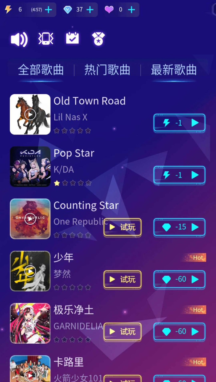 3、十分丰富海量的精品曲库,为玩家带来欢乐精彩 的游戏体验,是一款能最大化音乐乐趣的游戏。